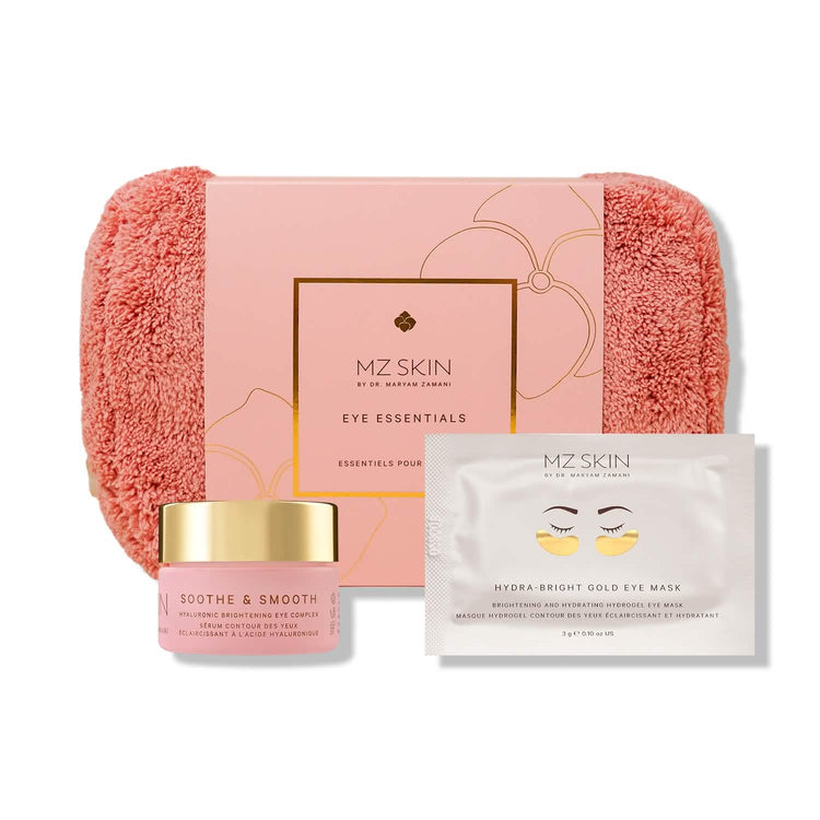 Enhance and restore skin radiance with this ultimate, results driven duo. The Eye Essentials collection, formulated to smooth and brighten the eye area, delivers instant relief and lasting hydration for a healthy, youthful appearance.This limited-edition kit contains+ Hydra-Bright Gold Eye Mask 5 pack (a gold hydrogel eye mask to instantly revive tired eyes).+ Soothe & Smooth (a firming, ceramide-rich eye cream for youthful, radiant eyes).+ A limited edition MZ SKIN make up bag.