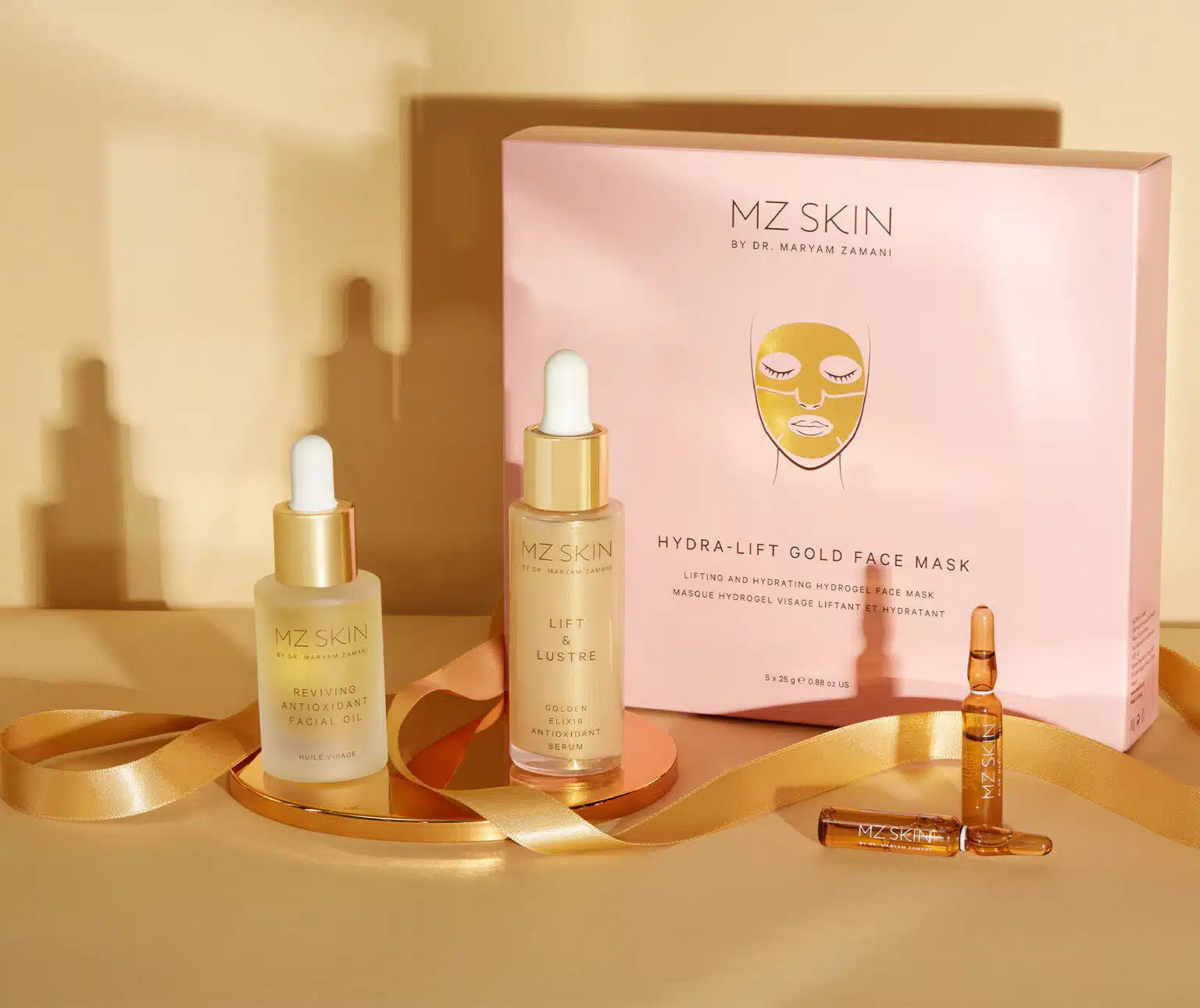 Hydra-Lift Gold Face Mask + Clinically proven to improve smoothness in 1 month+ Lifts areas prone to sagging+ Reduces the appearance of hyper-pigmentationReviving Antioxidant Facial Oil+ Omegas, aminos and essential fatty acids deeply nourish and strengthen dull, dry and dehydrated complexions+ Vitamin-rich antioxidants protect against damaging free radicals and oxidative stress to help minimise signs of premature ageing+ Mastic Tree Tears help visibly firm, plump and lift skin for a healthy, youthful glowLift & Lustre+ Clinically proven to improve skin radiance by up to 147% after just 1 hour+ Formulated with low and high molecular weight Hyaluronic Acid to deeply hydrate+ Clinically proven to increase moisturisation by up to 53% after 4 weeksGlow Boost Ampoules Duo+ Promotes cellular renewal by stimulating exfoliation+ Helps diminish appearance of age spots and wrinkles+ Improves texture and smooths the skin