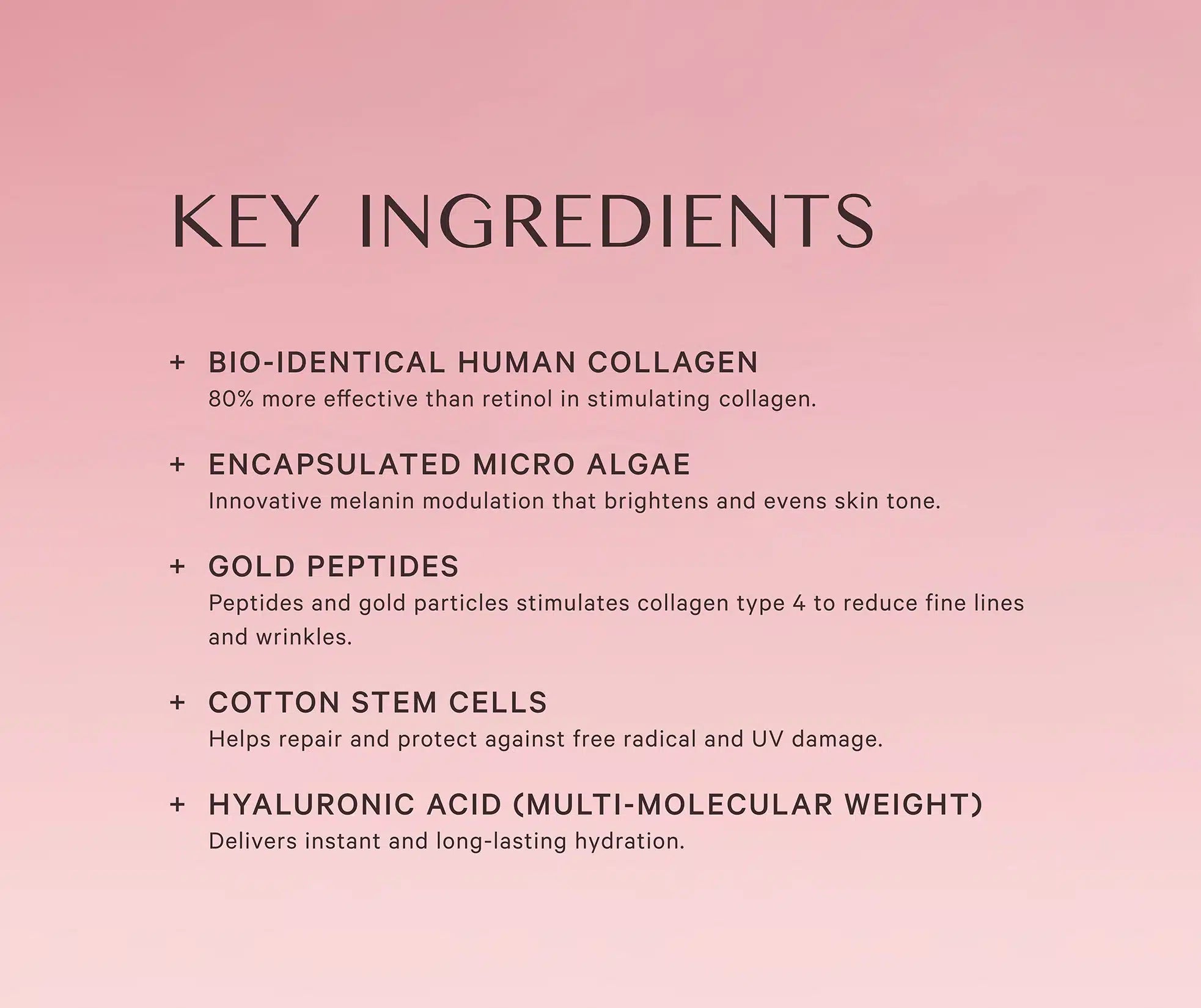 This super-lightweight daily moisturiser combines hydrating, brightening and skin-firming actives to reveal a youthful-looking complexion for all skin types. Multi-molecular hyaluronic acid delivers an instant burst of hydration and penetrates deeply for long-lasting results. Innovative, first-of-its-kind bio-identical human collagen plumps, firms and lifts. Peptide complex is infused with gold particles to help reduce the appearance of fine lines and wrinkles. Antioxidant-rich cotton stem cells repair and protect against free radical and UV damage. Clever encapsulated microalgae deliver innovative melanin modulation to reduce pigmentation by brightening and evening the skin tone. In combination with six natural oils and extracts, this powerhouse formula absorbs in an instant to keep you glowing with youthful radiance.
