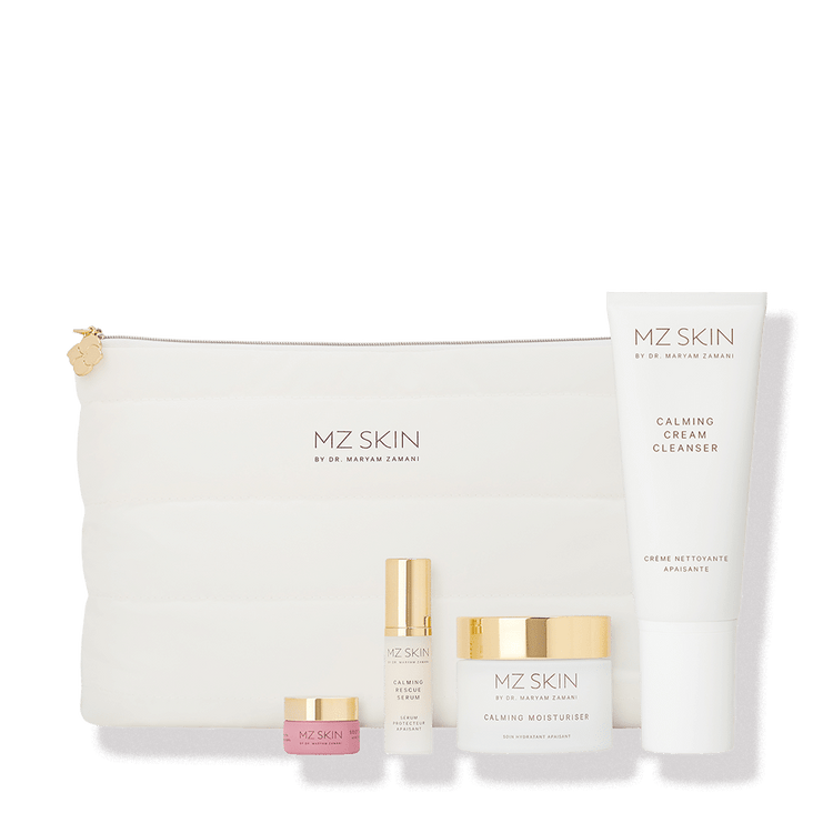Experience the MZ SKIN promise of transformative results, through simple yet sensory rituals, gentle enough for the most sensitive of skin:+ The Calming Cream Cleanser transforms into a luxurious foam when in contact with water, it Reveals cleansed, refreshed, and deeply hydrated skin.+ Soothe & Smooth plump, smooth fine lines, and deeper wrinkles while restoring suppleness around the eye.+ The Calming Rescue Serum visibly calms the complexion and leaves skin feeling healthy and rejuvenated.+ The Calming Moisturiser ensures skin is nourished, protected, and beautifully balanced from first use.+ Luxurious MZ SKIN Toiletry Bag to keep all your skincare favourites with you at all times