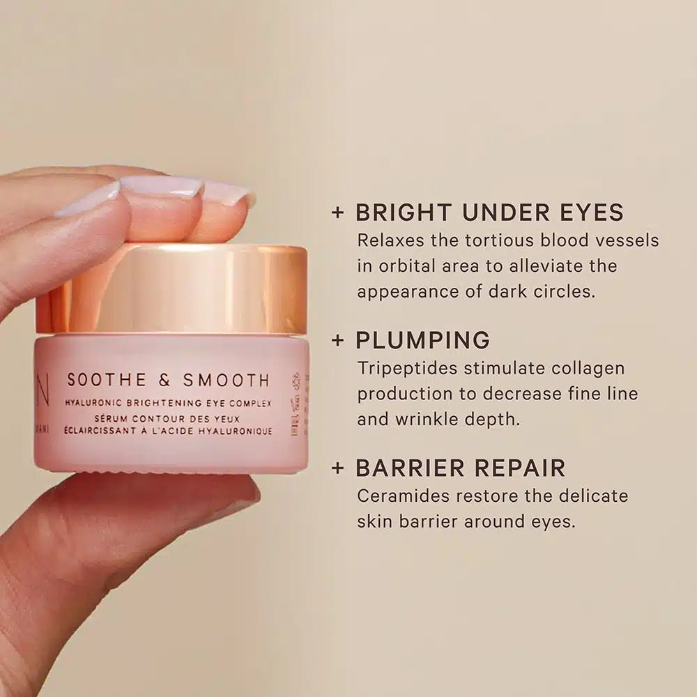 Soothe and Smooth (14ml) is a firming eye cream containing a tri-peptide to stimulate collagen and elastin. Albizia Bark Extract detoxifies and strengthens capillaries, reducing dark circles.