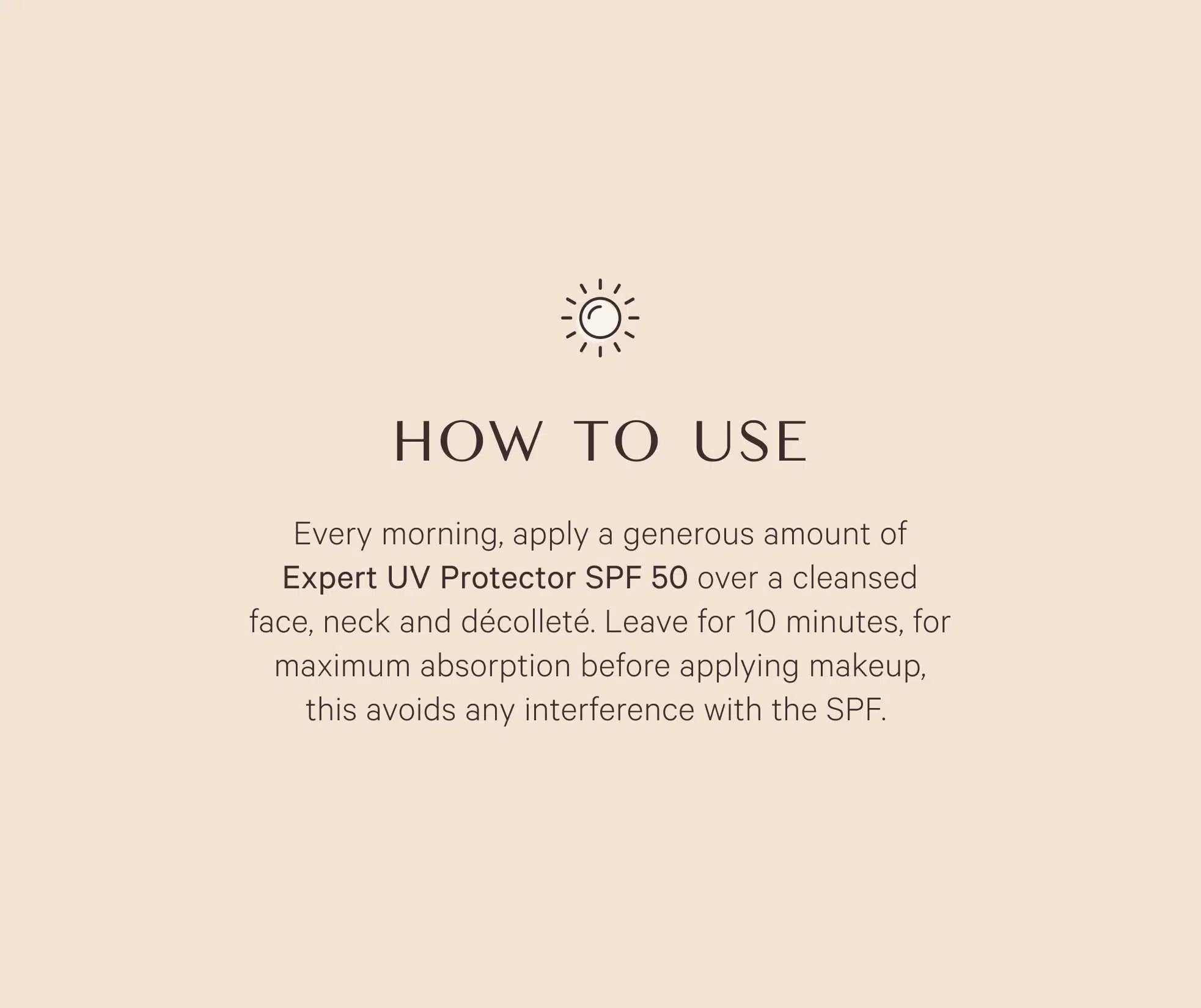 Lightweight and non-greasy, this advanced hybrid skin shield offers broad-spectrum UVA and UVB protection while delivering powerful skincare benefits. Suitable for all skin types, Expert UV Protector SPF 50 seamlessly blends with your routine, leaving an invisible finish without any white cast. Enriched with Arabian Cotton Stem Cell Extract to protect against free radicals and UV damage, a multi-molecular hyaluronic acid complex for instant and lasting hydration, Panthenol to boost moisture and support the skin barrier, and Niacinamide to enhance overall skin health and promote a soft, radiant complexion.